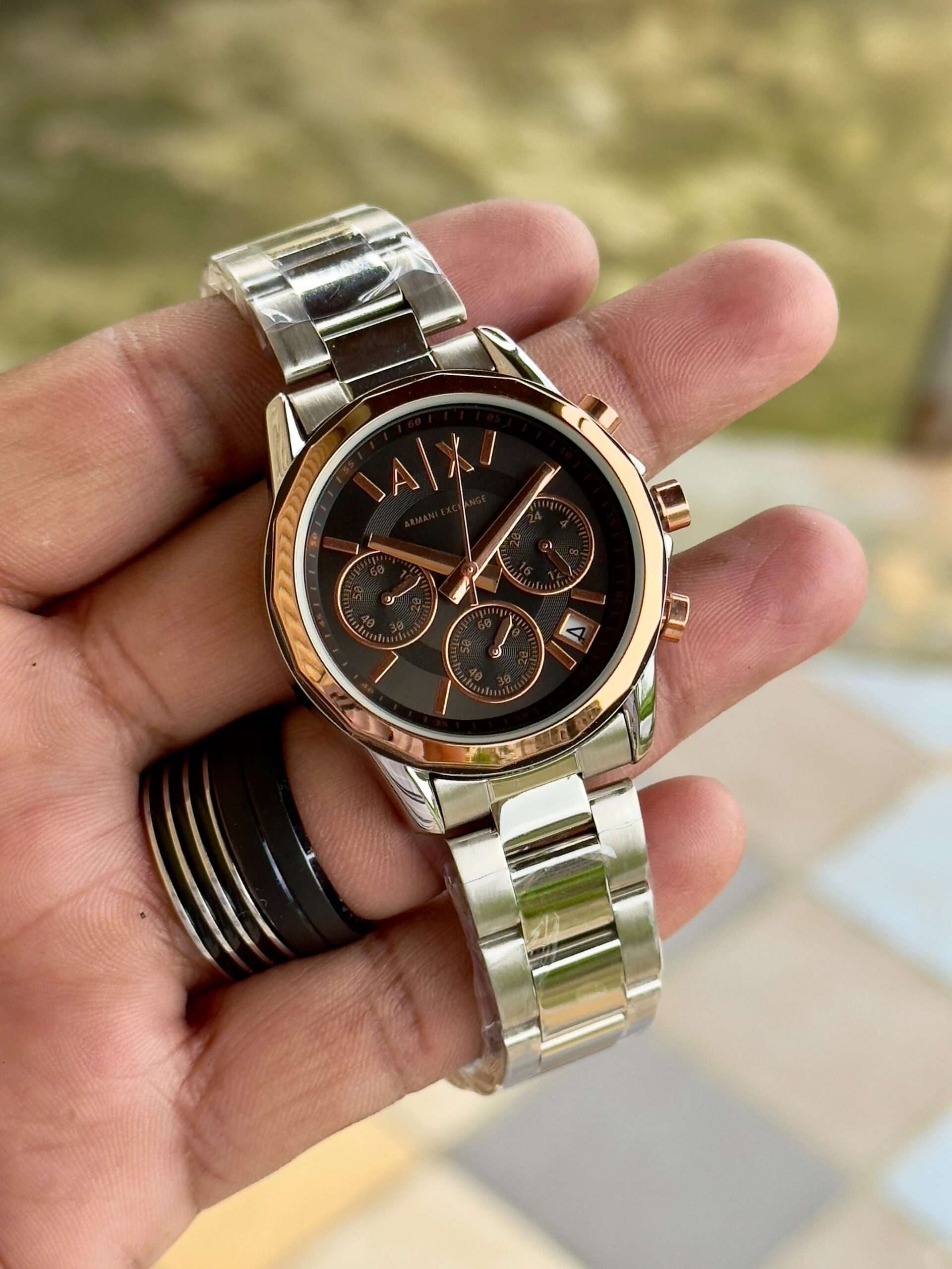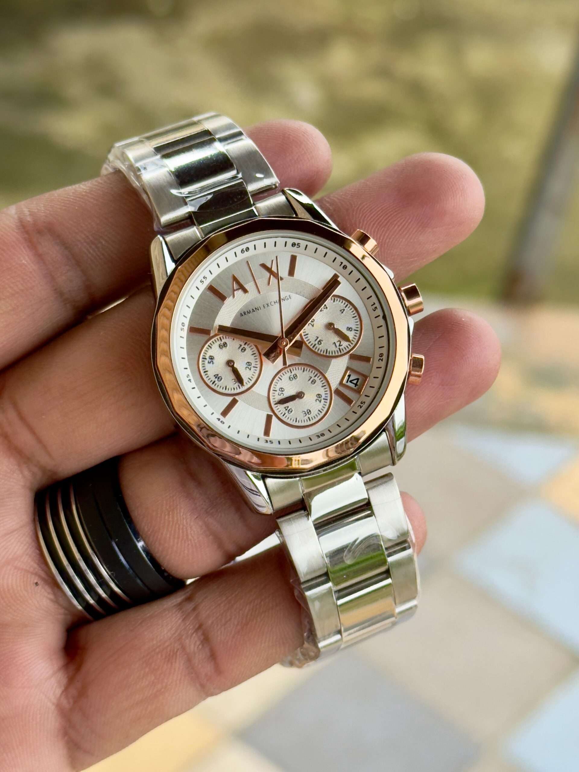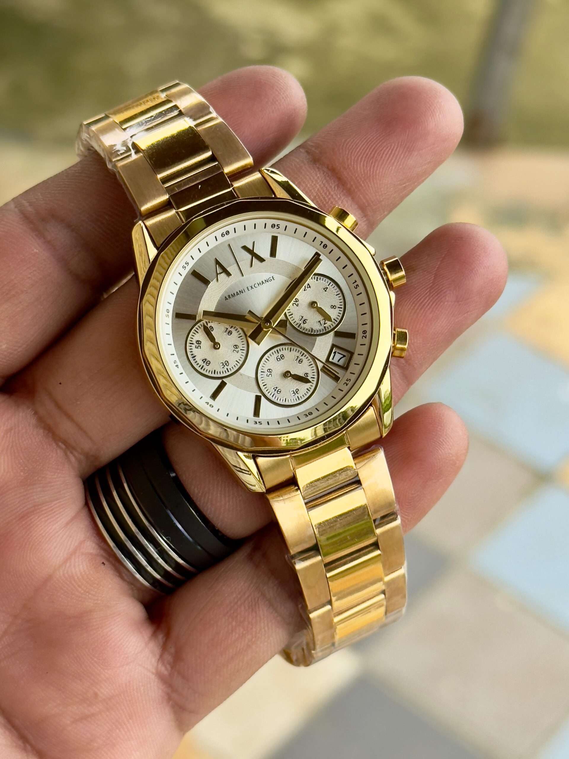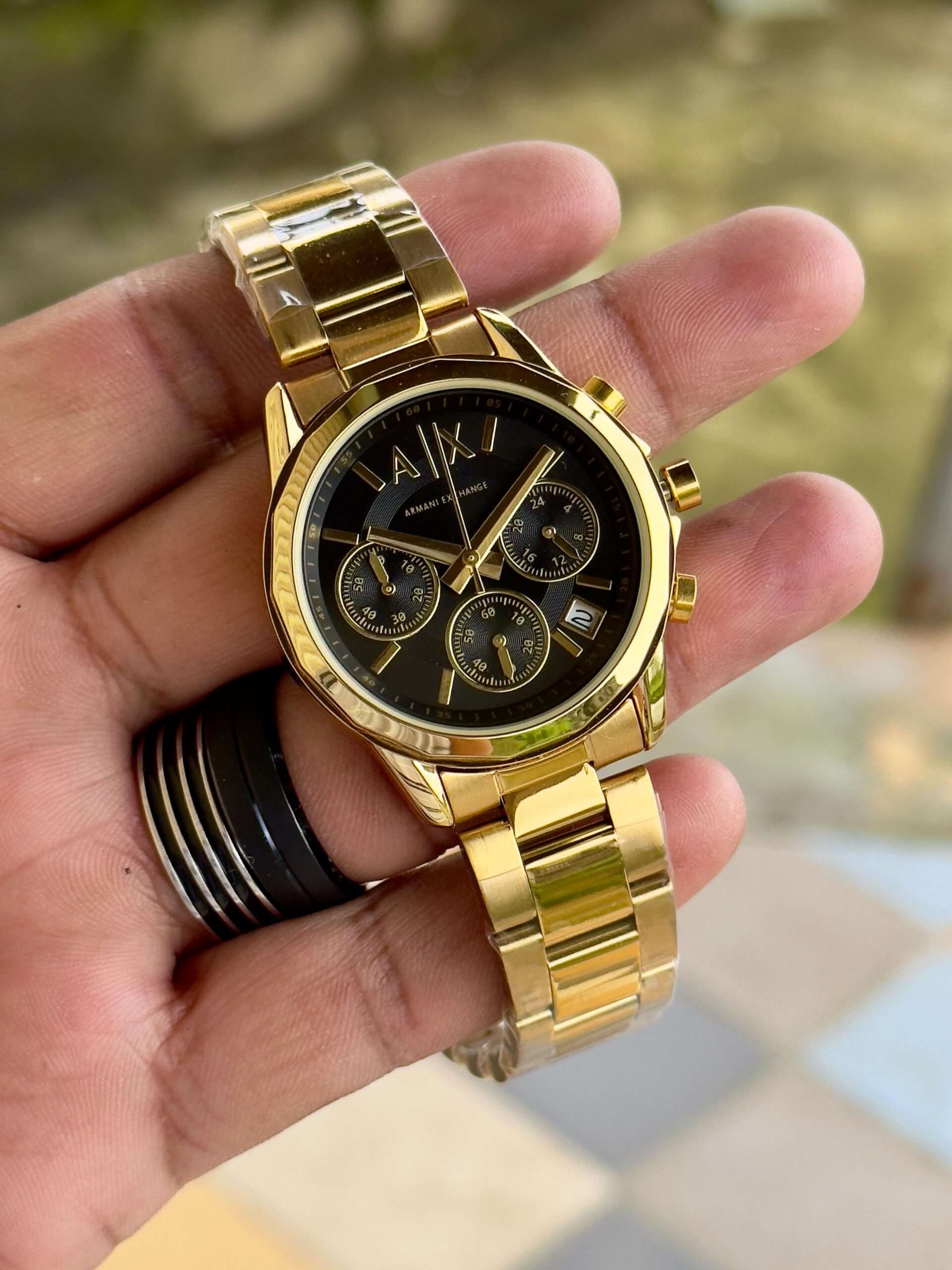 Adding to this is the “A|X” pressing lock, which provides both style and assurance. The secure clasp ensures the watch stays comfortably fastened while adding a signature branding detail. The engraved Armani Exchange initials highlight authenticity and reinforce the brand’s commitment to quality craftsmanship.