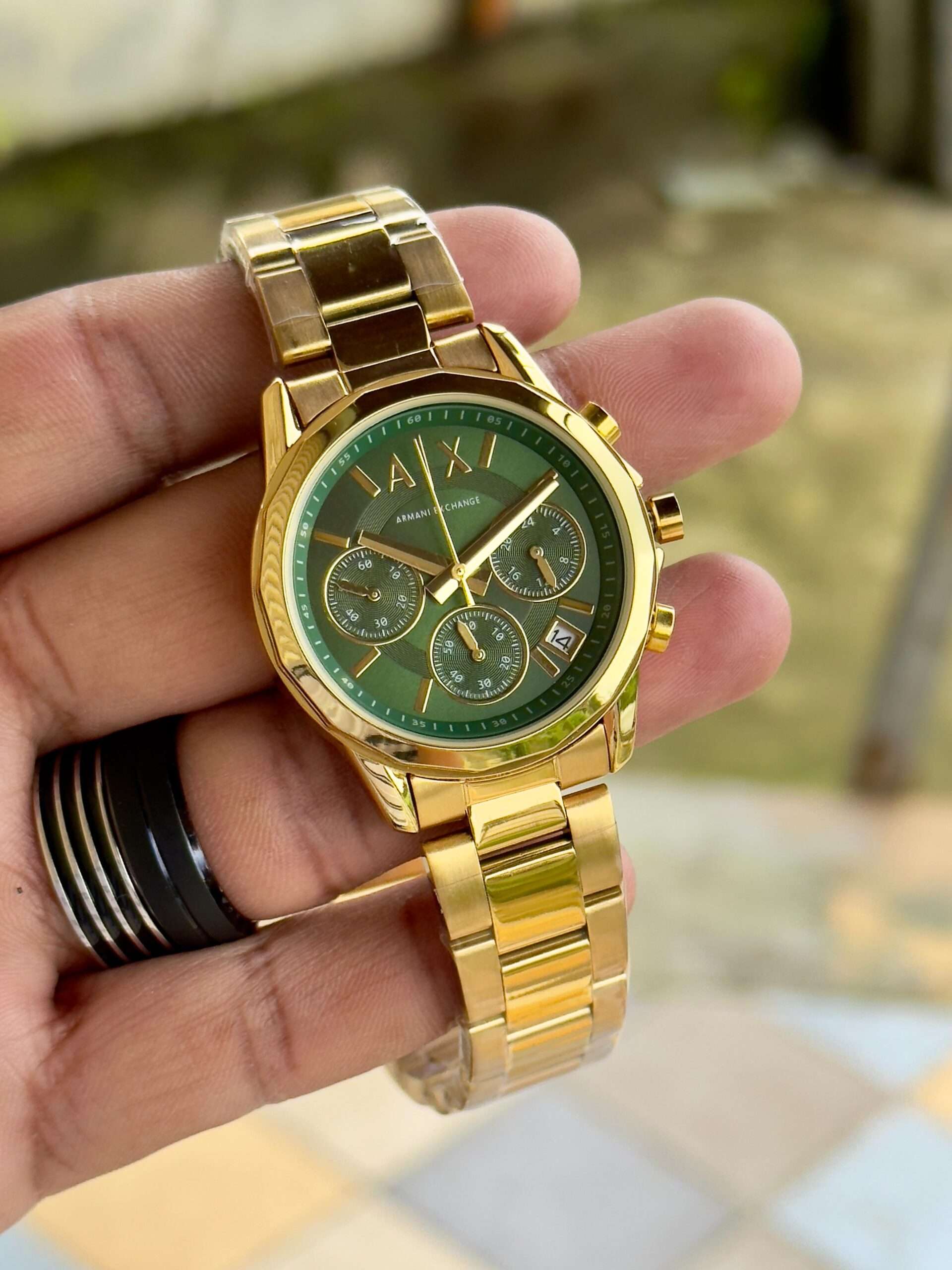 This Armani Exchange watch shines with a classy combo, sleek chronograph dials, and a bold modern design.