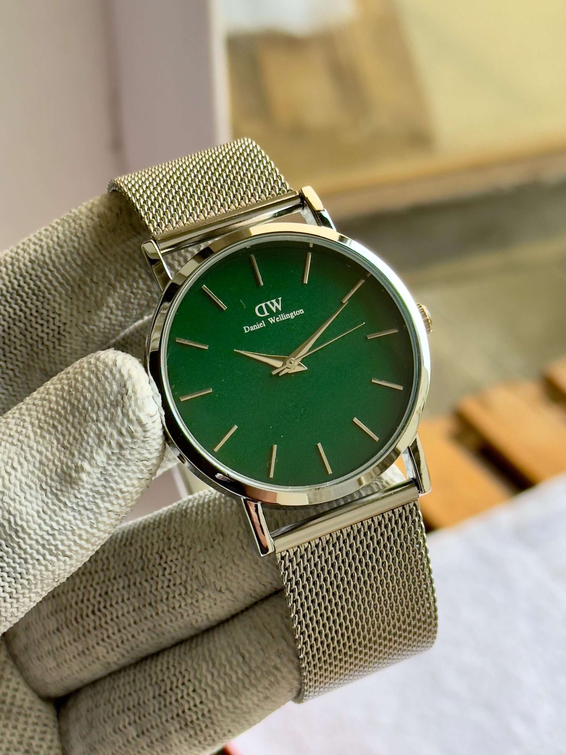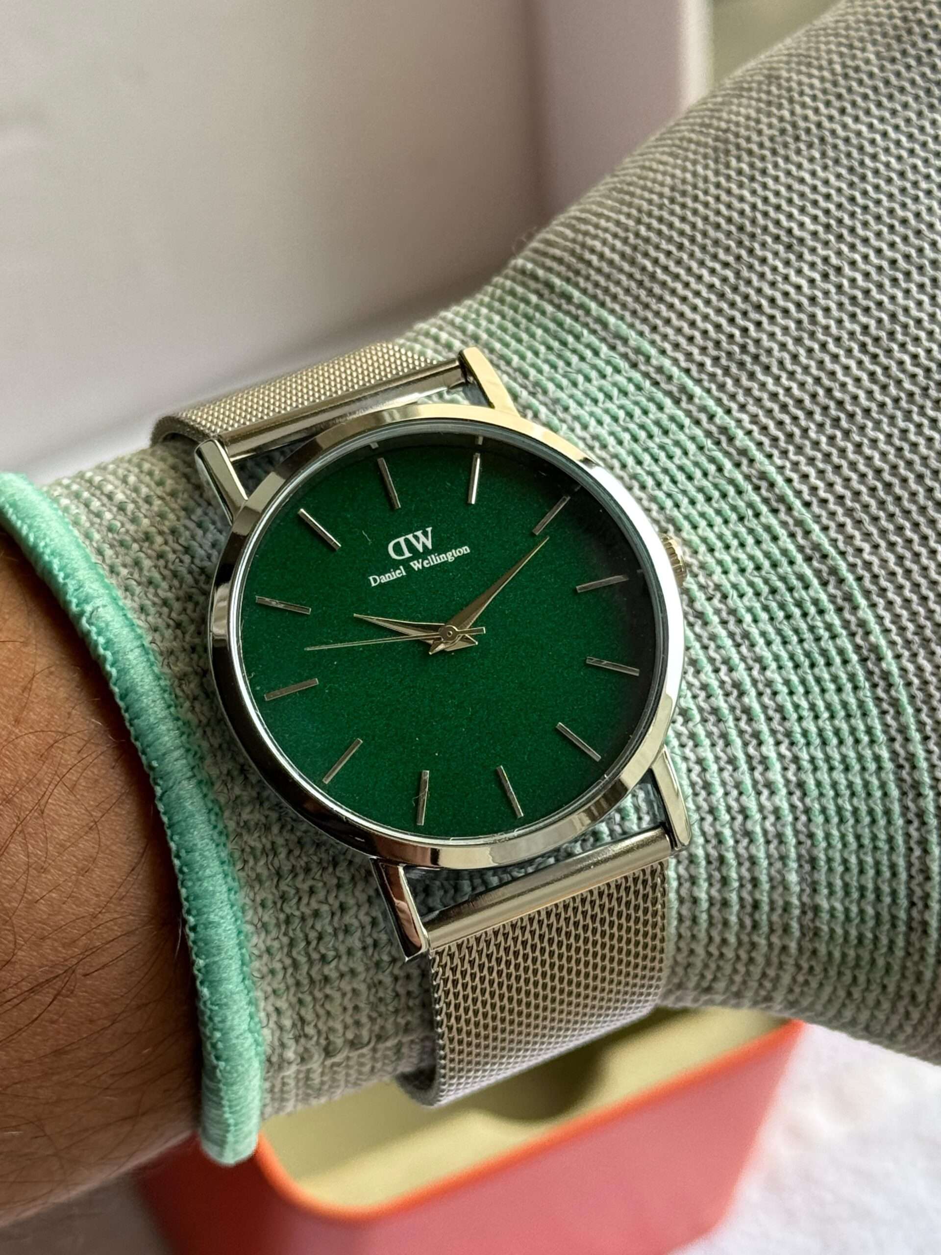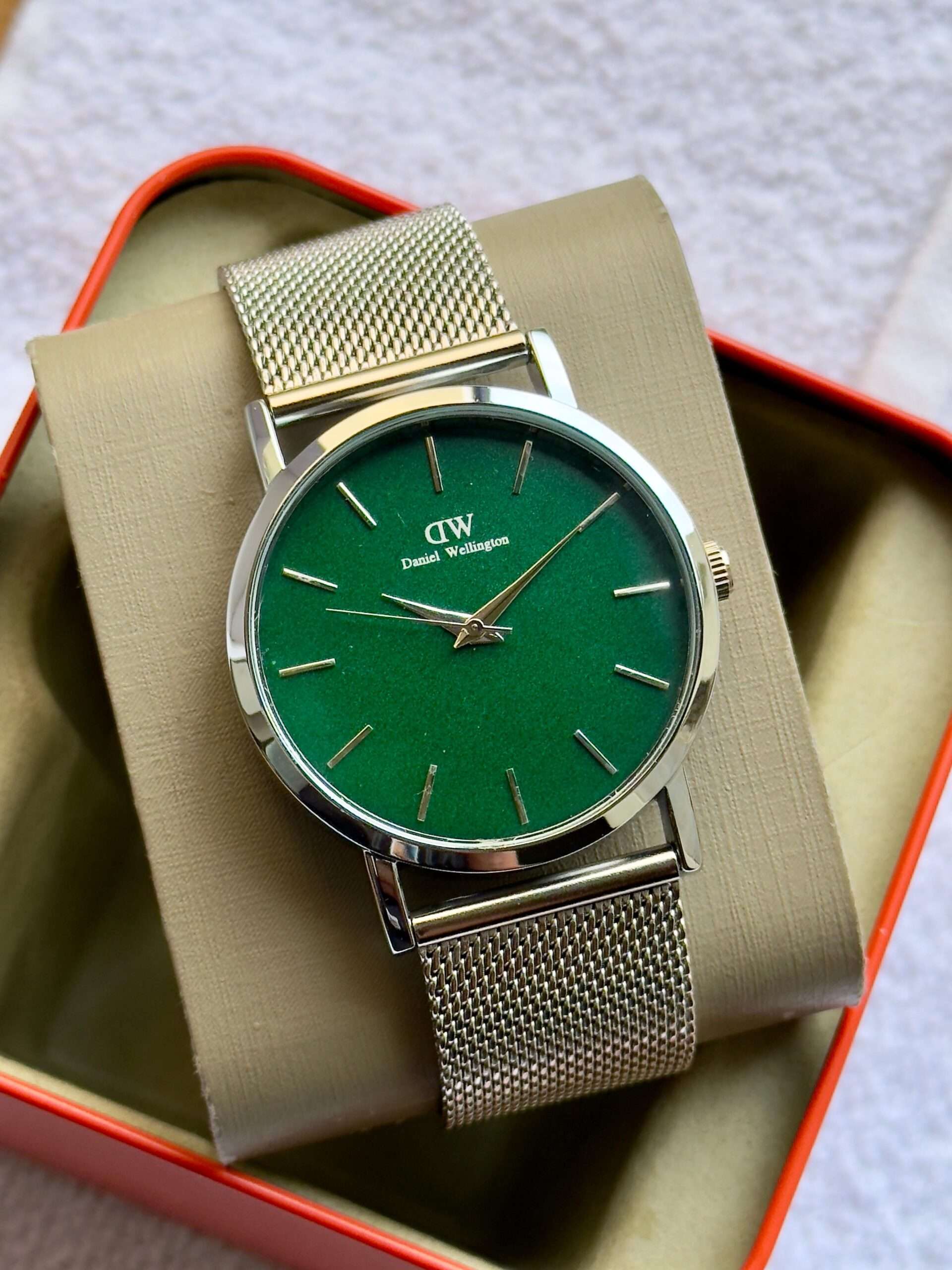This Daniel Wellington watch exudes timeless elegance with its sleek dial and refined silver mesh strap.