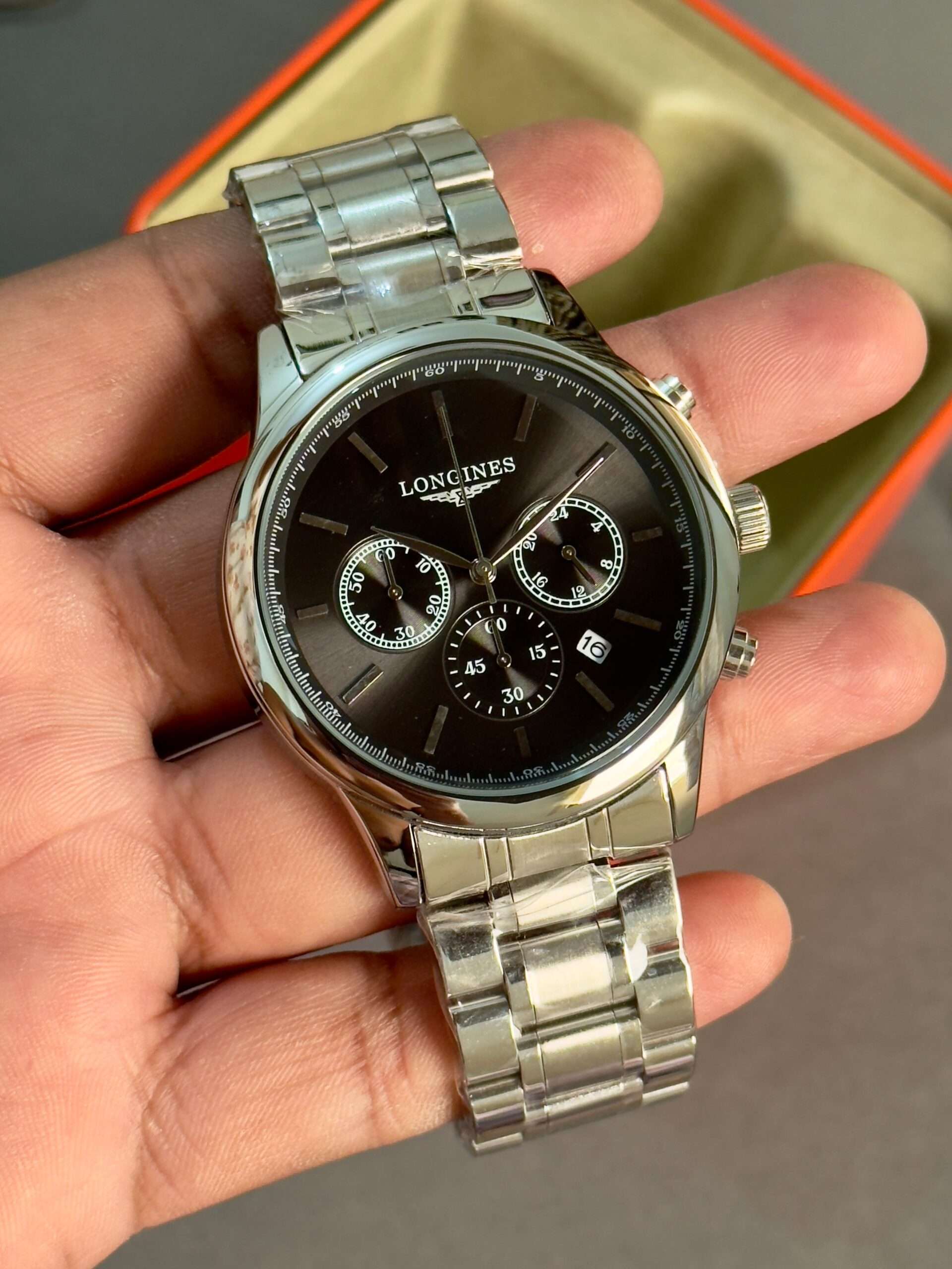This Longines timepiece exudes timeless elegance with its sleek dial, intricate subdials, and polished stainless steel bracelet.