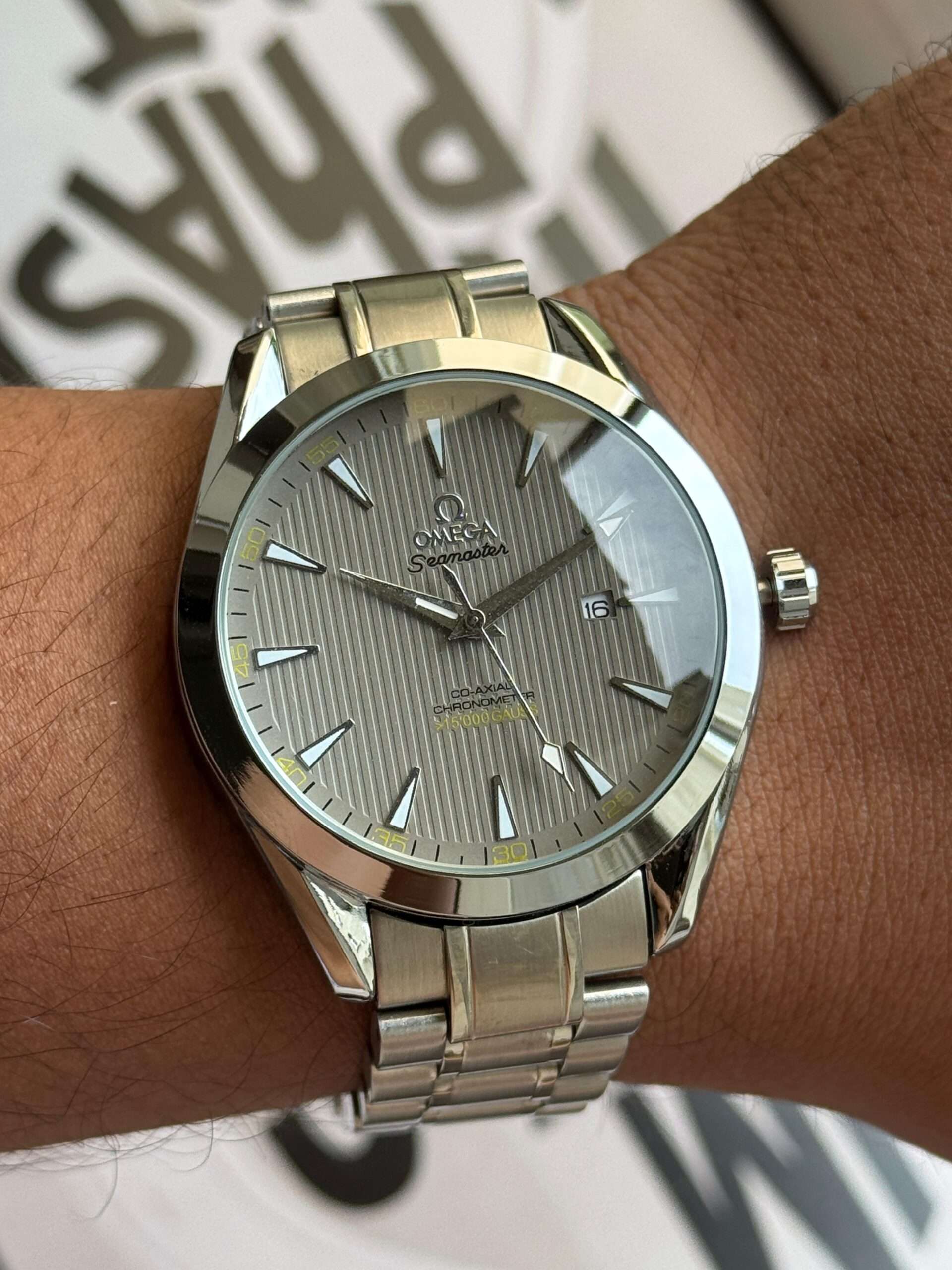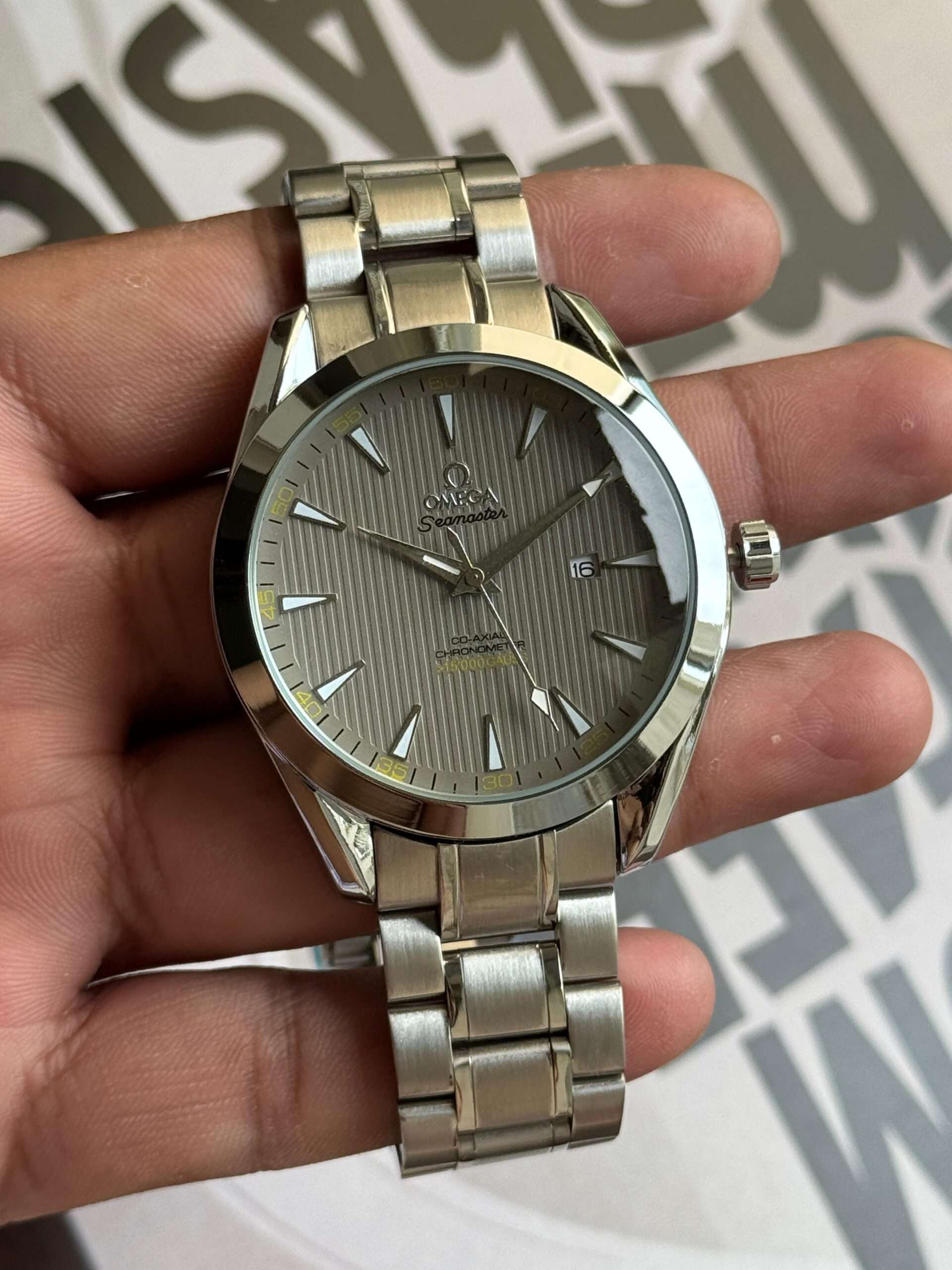 • ⁠Vertical teak-patterned grey dial