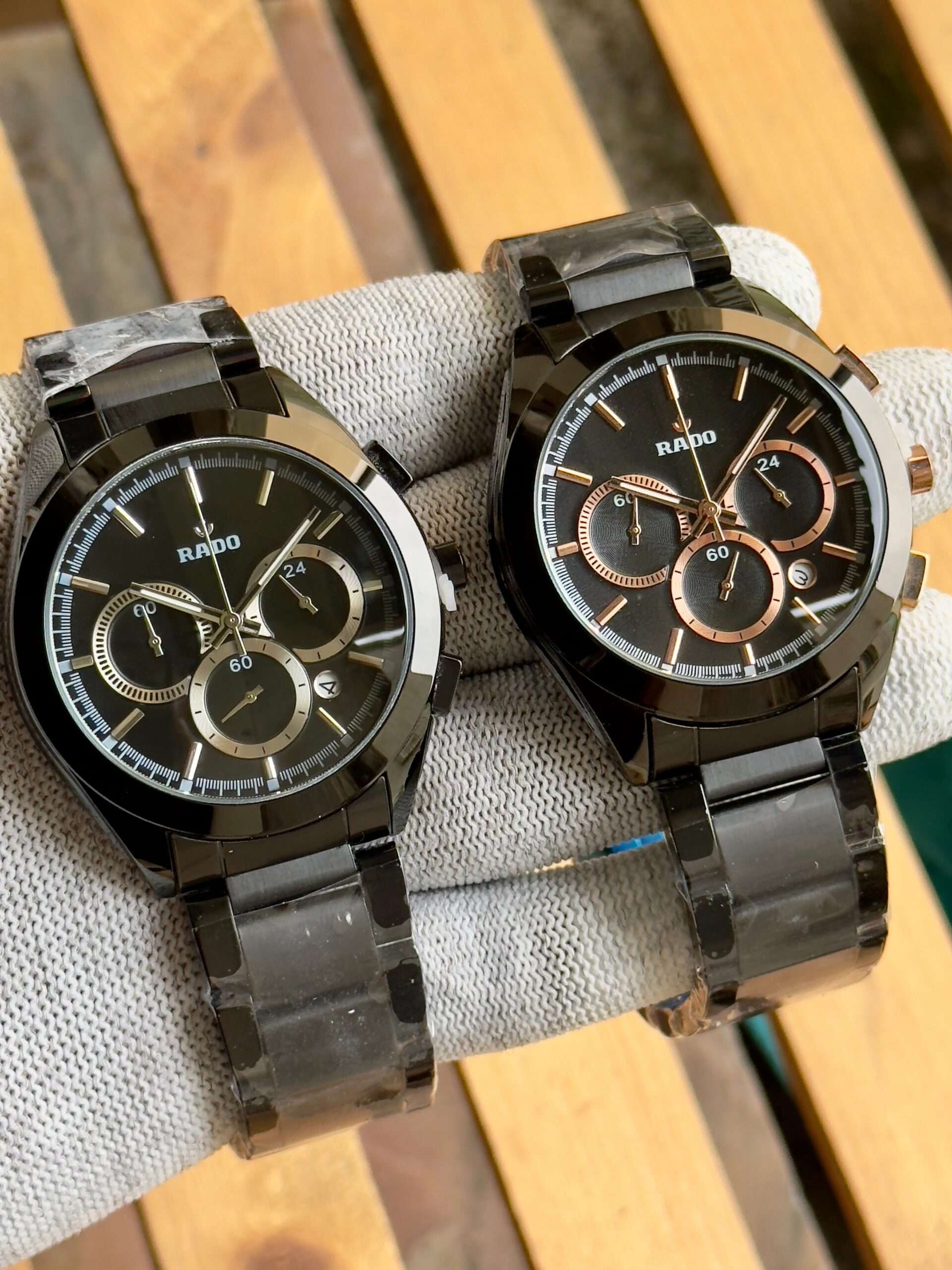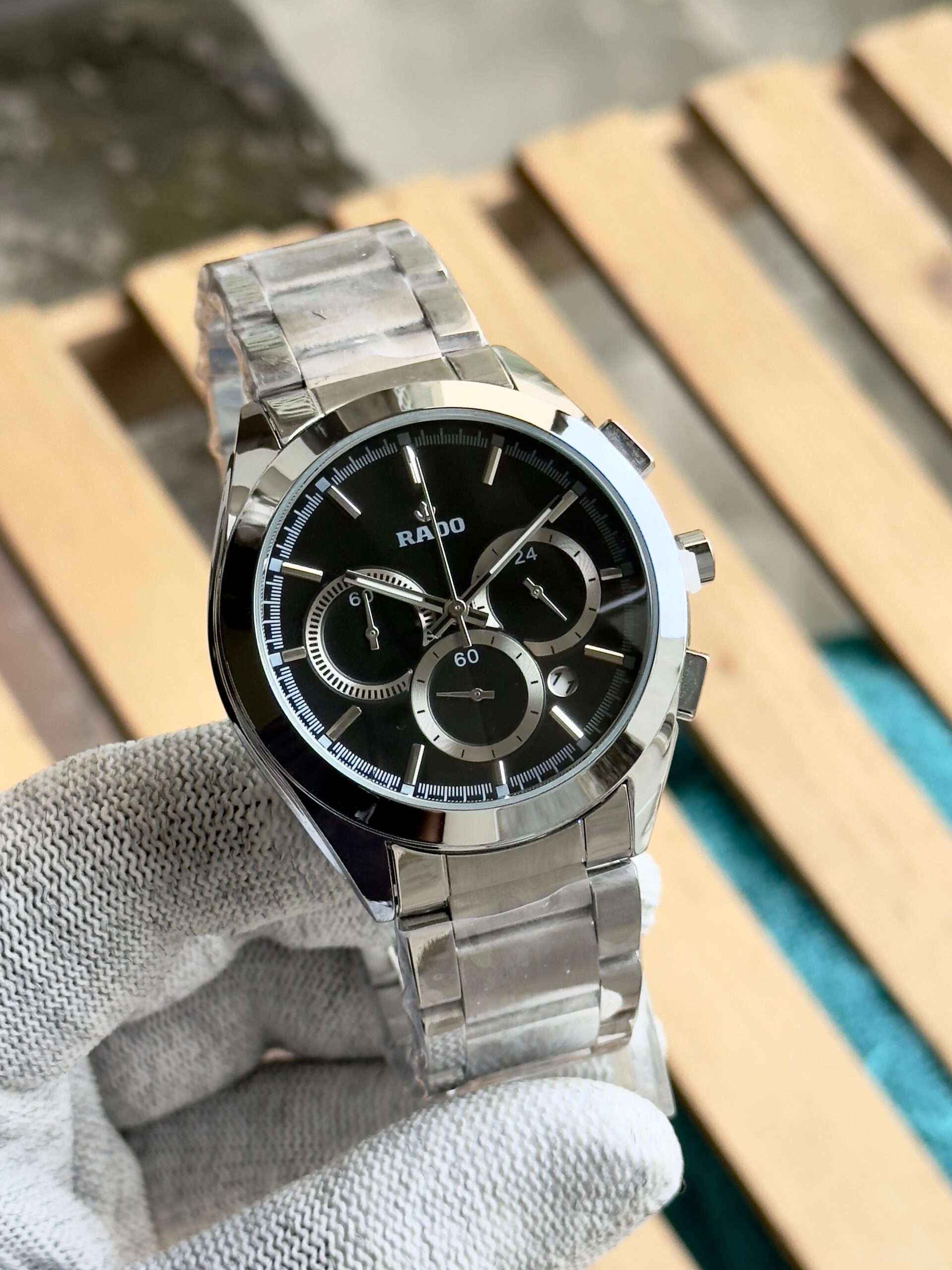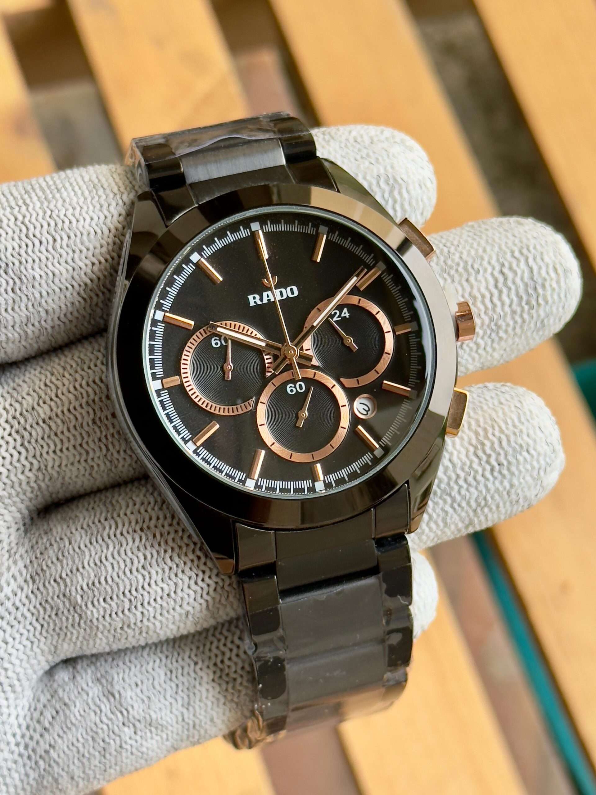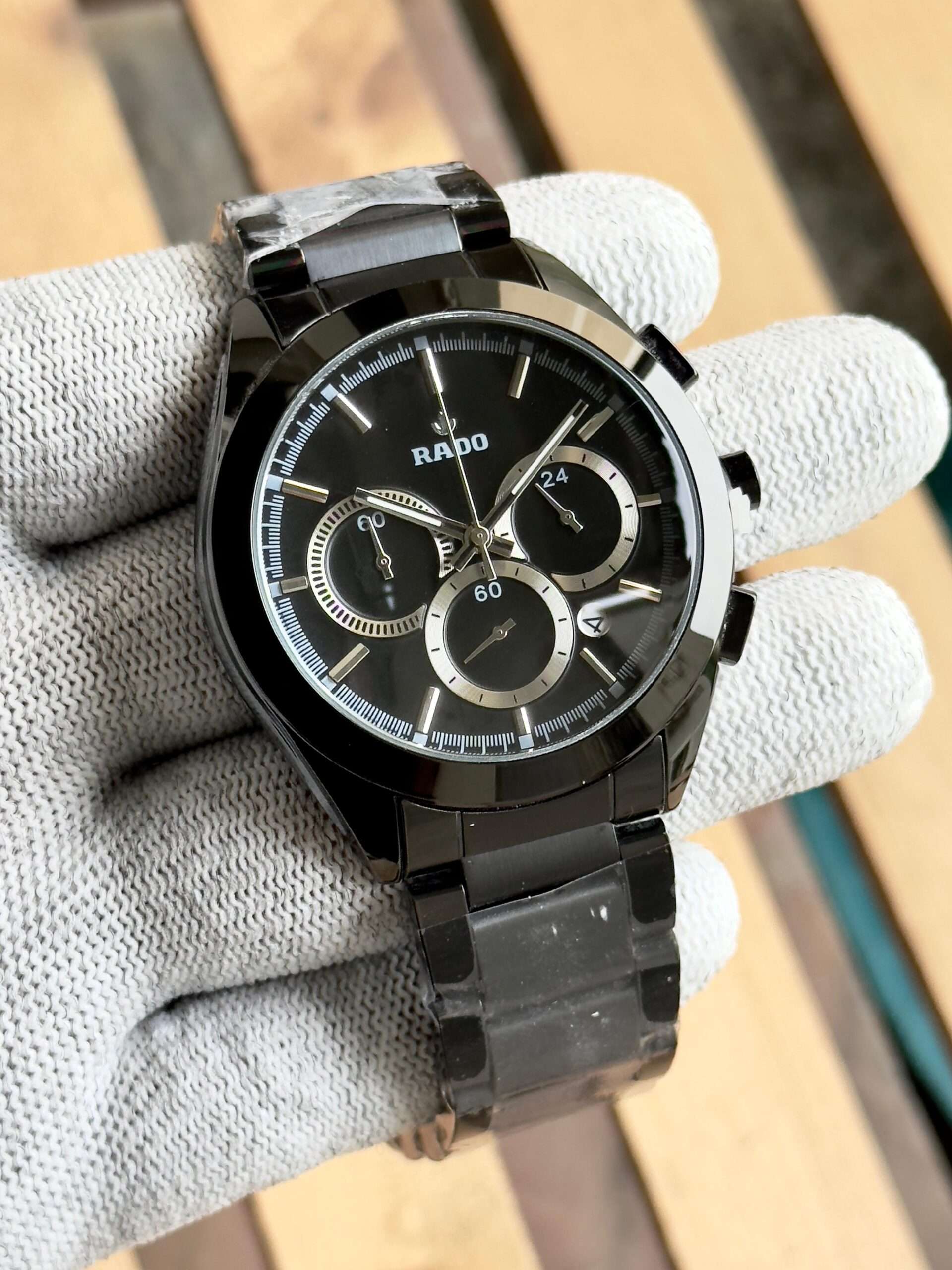 This Rado watch exudes sleek sophistication with its bold black finish and precision-crafted chronograph design.