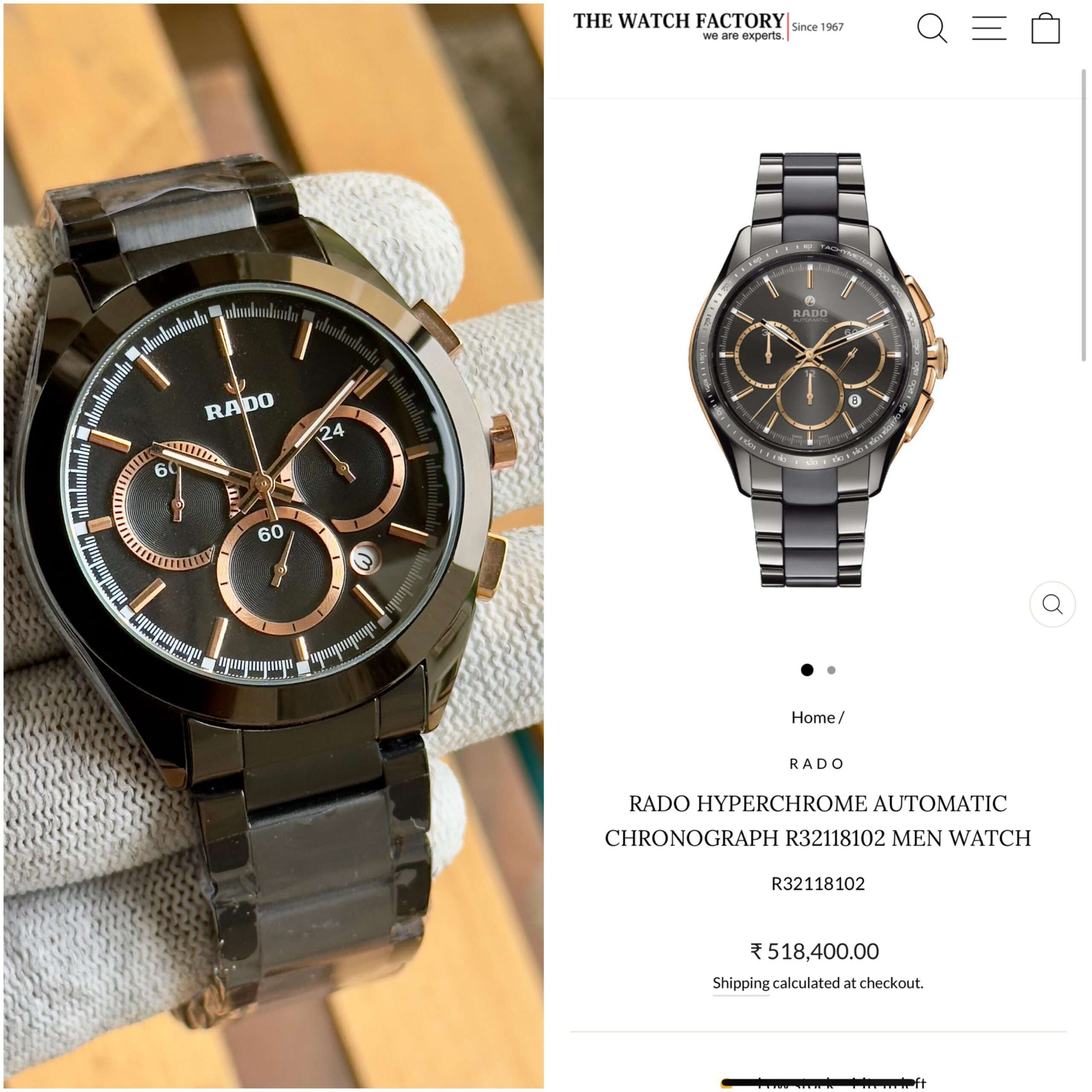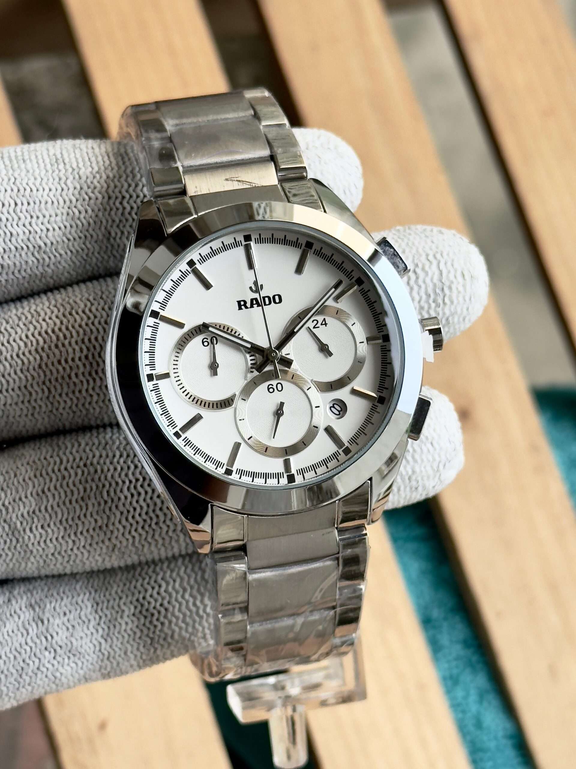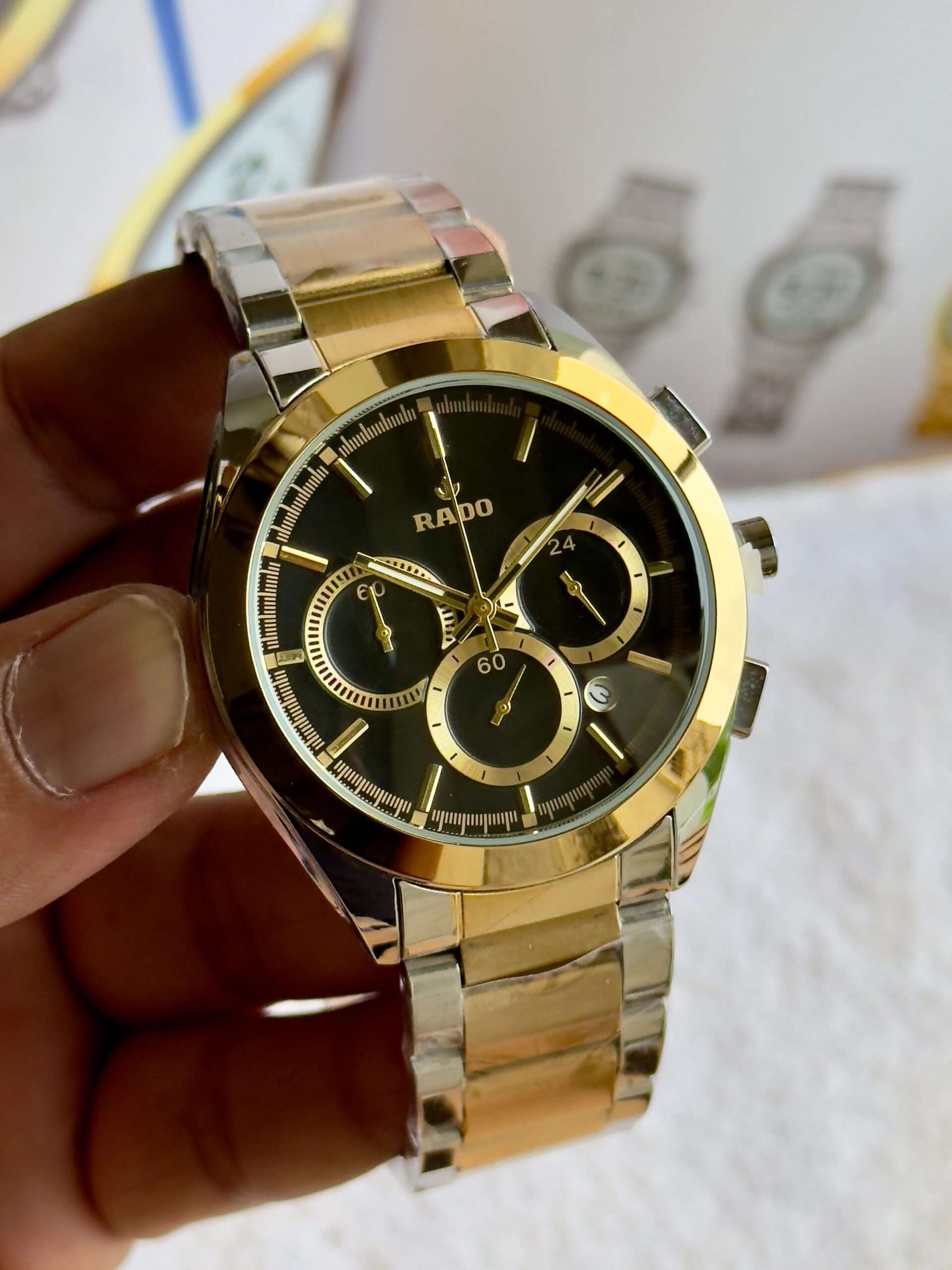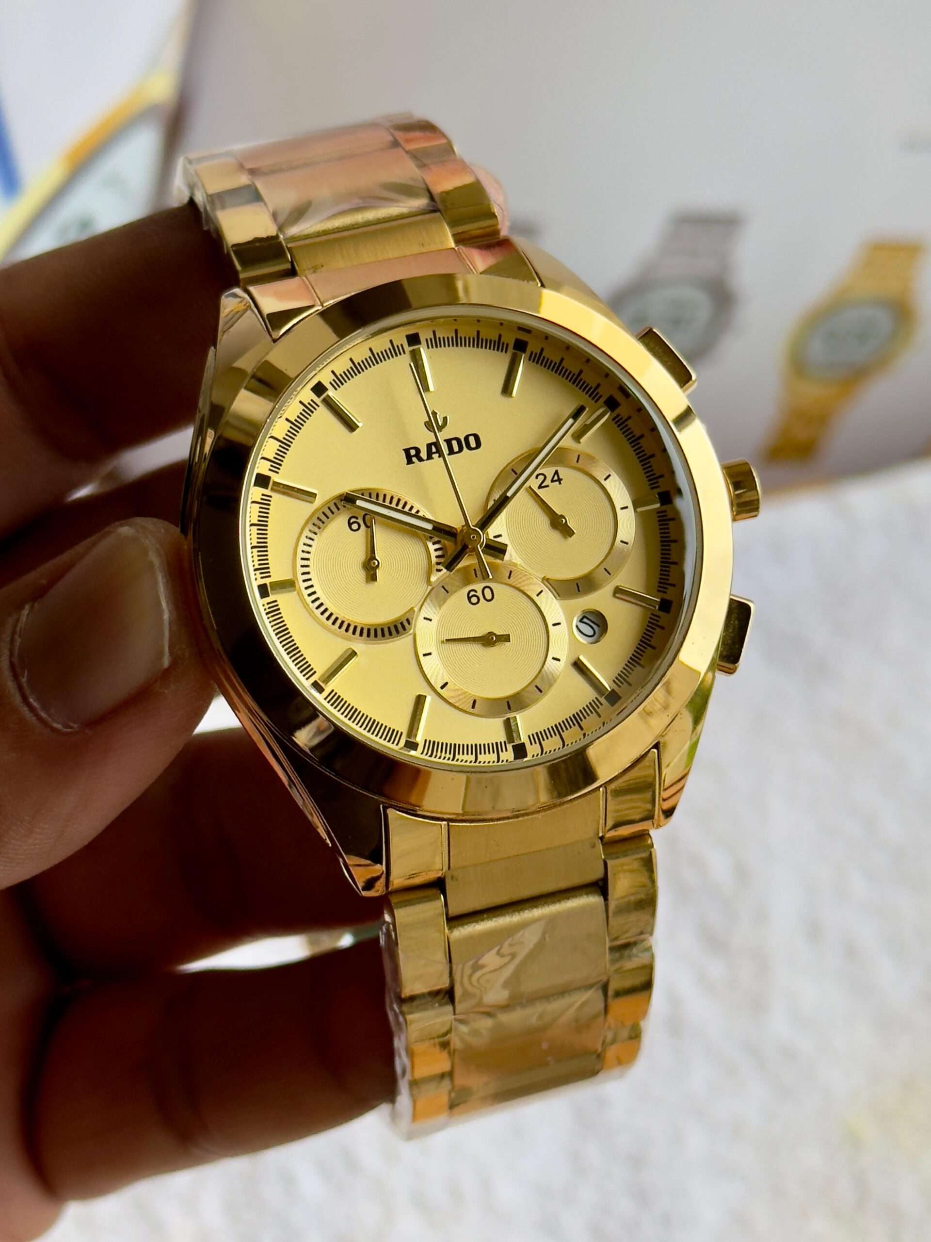 This Rado watch exudes sleek sophistication with its bold black finish and precision-crafted chronograph design.