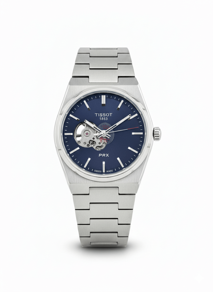 The Tissot PRX’s timeless design and open-heart dial elegantly showcase its Swiss craftsmanship.