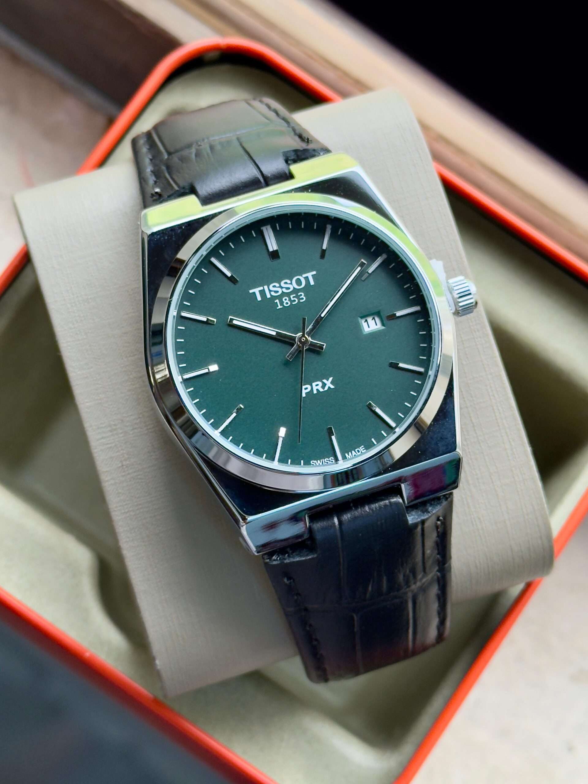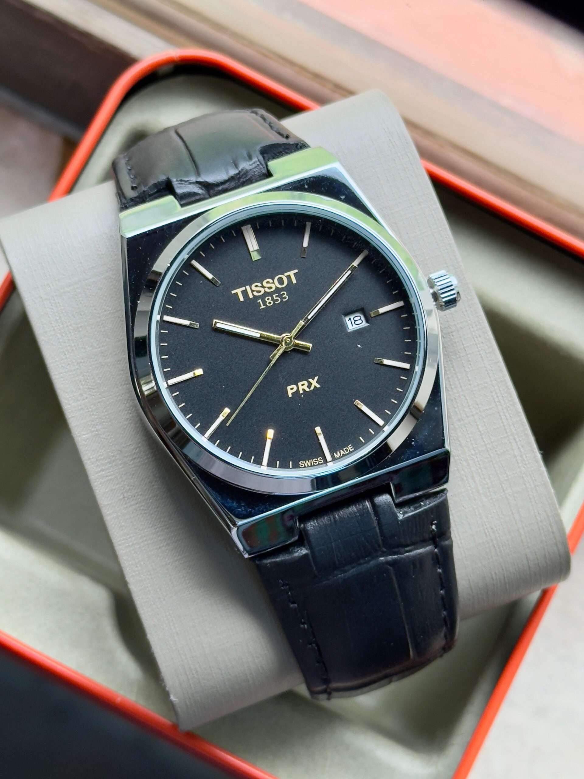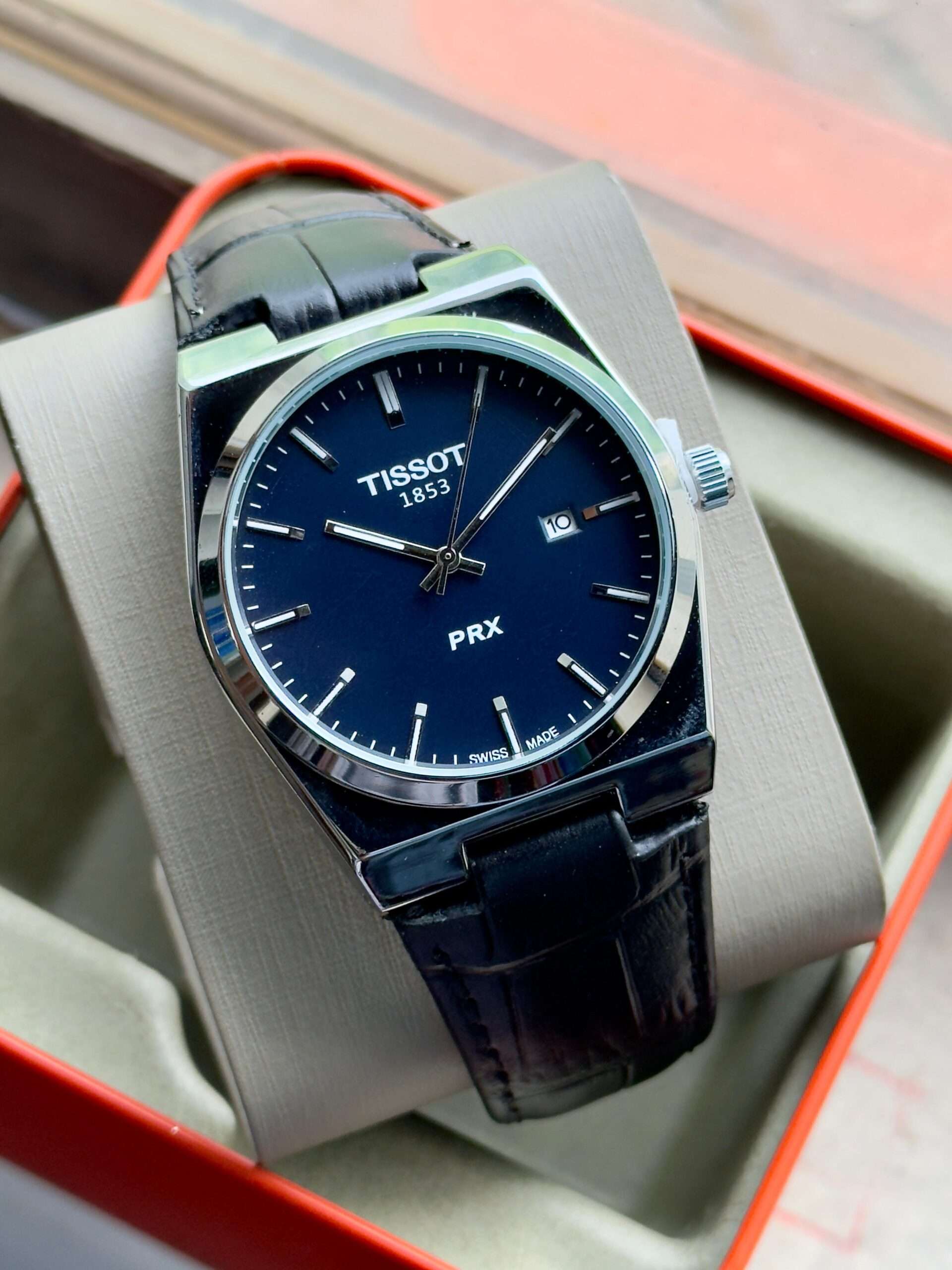The Tissot PRX exudes timeless elegance with its sleek design, and luxurious leather strap.